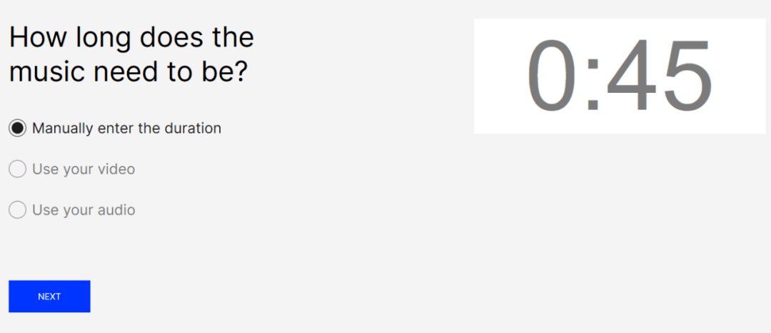点击“NEXT”按钮进入下一项,询问配乐需要多长时间。默认为“Manually enter the duration(手动输入时长)”,直接在右侧输入即可,本例设置为45秒。另外还可以根据需要配乐的视频(Use your video)或音频(Use your audio)自动调整长度,这两种方式要求上传相应的音视频素材(图35)。