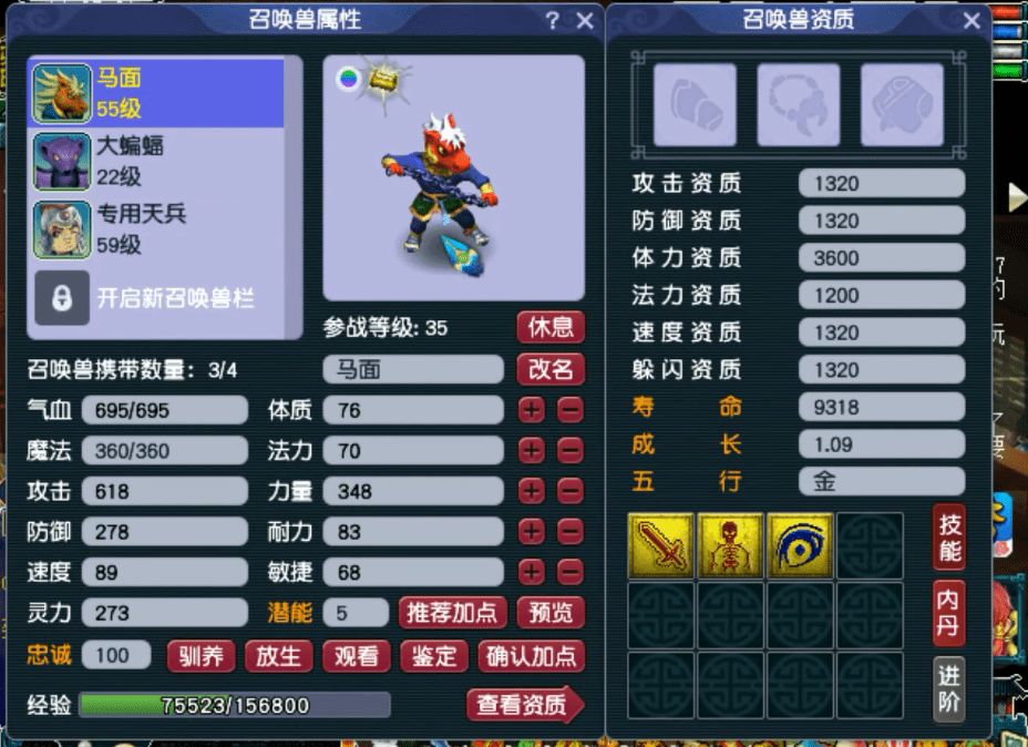 宝宝还是系统绑定的3技能马面,等级也是一步步跟着升级上来了,还记得你当年带马面的样子吗?