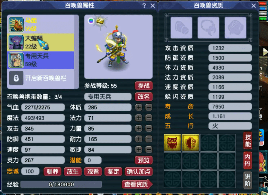 还有一只2技能天兵,也是系统送的,不过没有带低级必杀,失去了天兵的灵魂,原号主也是血耐加点,做了一只血宠。