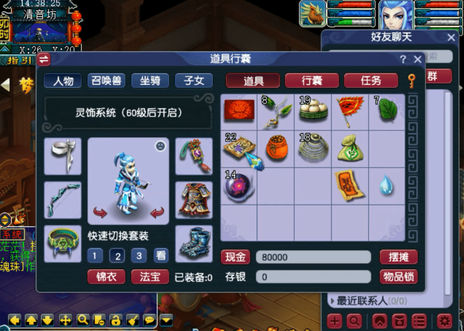 身上和背包里都是系统给的专用装备和道具,现在系统对新人还是比较友好的,最起码不用自己攒钱买装备,每到一定的等级,就会获得相同等级的装备,为你的升级之路保驾护航!