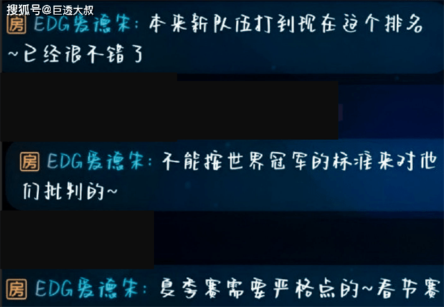 EDG曾经在世界赛夺冠,粉丝众多。可惜圣枪哥、scout和viper全部离队,leave、fofo和阿乐加入,的确是新阵容。所以爱德朱希望大家宽容一点,别拿s冠的标准去要求他们。夏季赛可以严格一点,春季赛还是多给机会。