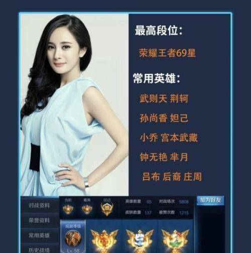 杨幂因出演仙剑奇侠传一角而家喻户晓,并在电视剧《再宫》中成为娱乐圈的大腕之一。让人意外的是,杨幂还喜欢玩王者荣耀,甚至达到了王者荣耀69星的地步。任何职业都有常用的英雄,所以即使是职业联赛也挡不住这个技能。我也和baby相爱相杀,名字的字条上也改了名字。