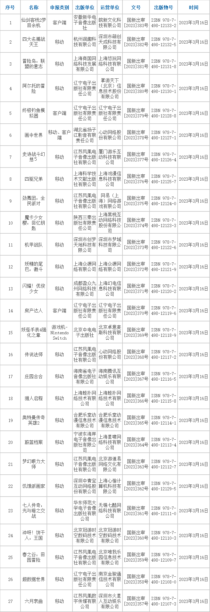 其中,国产网络游戏申报类别划分为「移动」的游戏共有22款,「客户端」的游戏共有3款,「移动、客户端」和「游戏机-Nintendo Switch」的游戏各有1款。