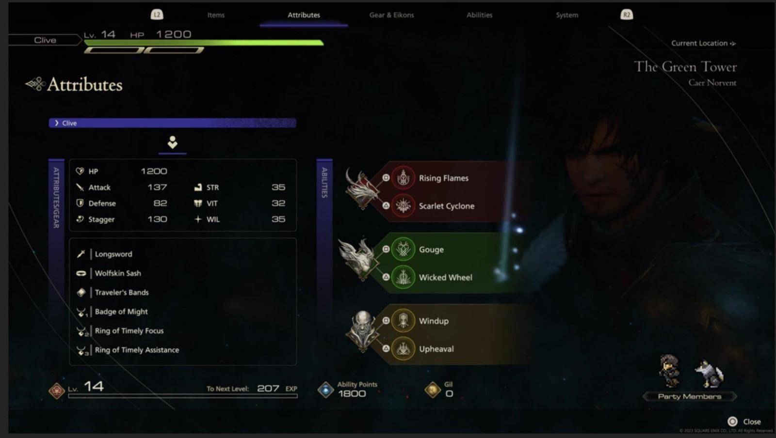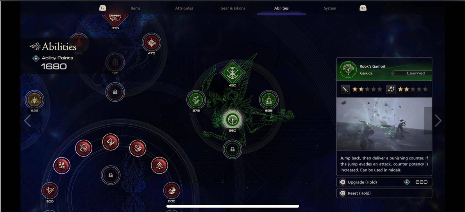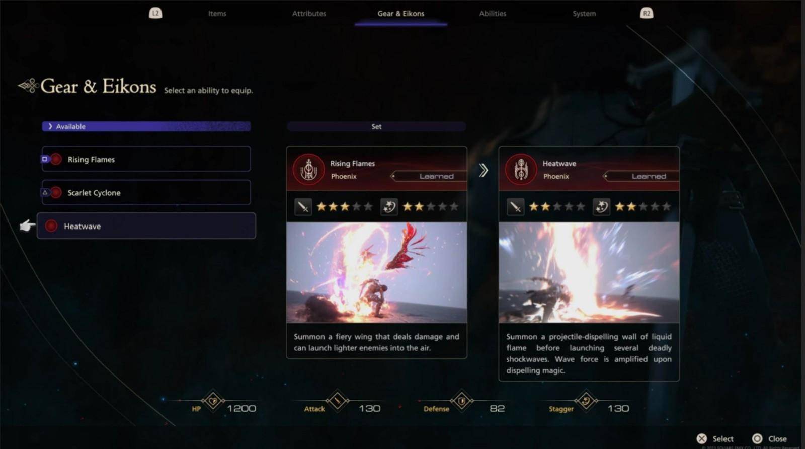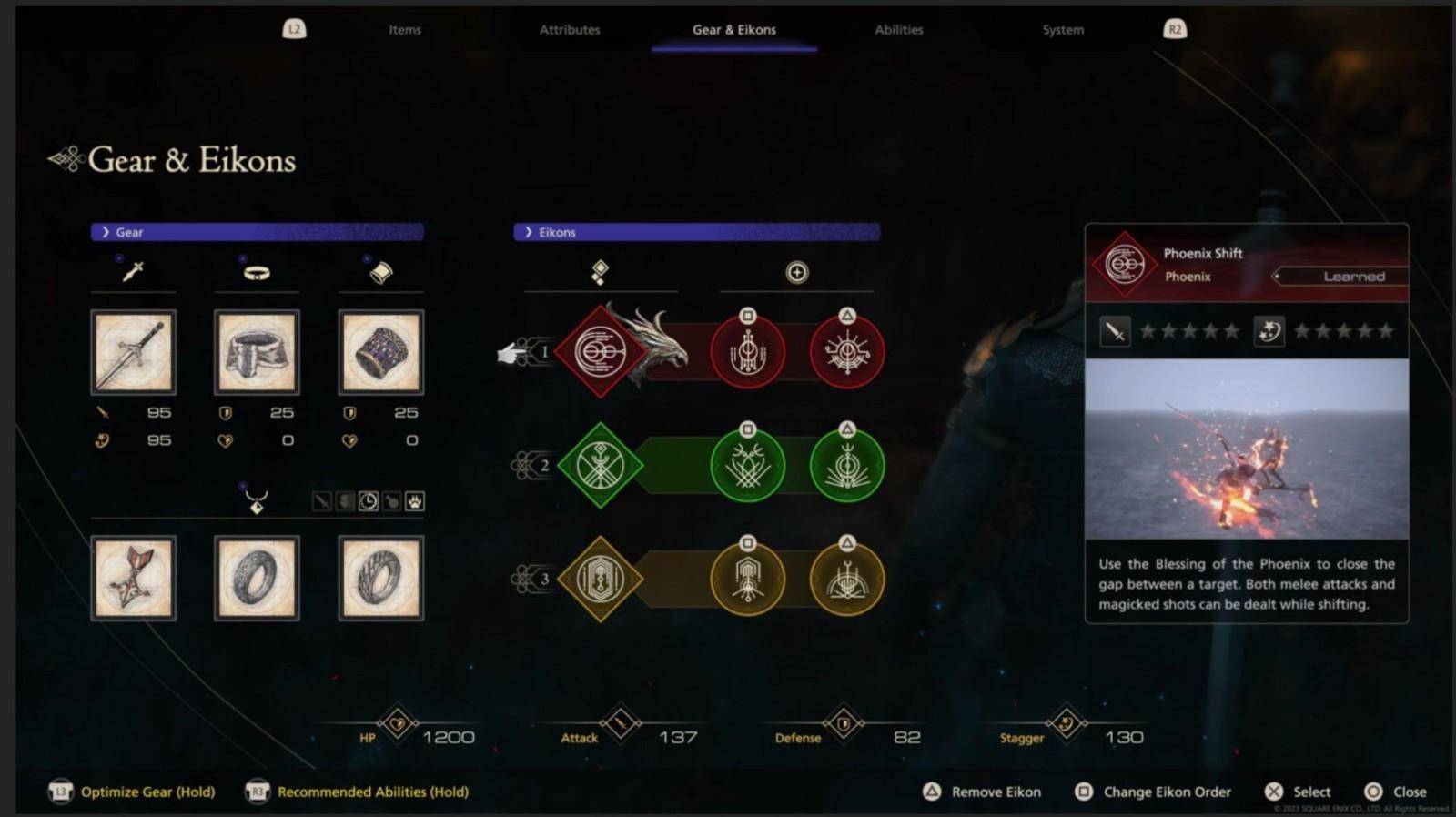 《最终幻想16》的装备、EIKON、属性和能力菜单: