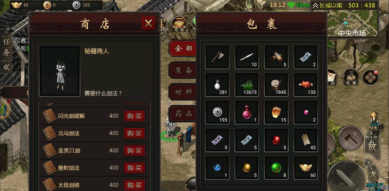 我们一般认为的打金是元宝、装备。但是这款游戏有点不一样,就是我们掉落的所有物品都是可以交易的,也就是所谓的搬砖。当我们已经了解元气和武功的关系时,我们可以去买你想买的武功秘籍了,只需要找到对应的NPC,花四百钱币购买完就可以慢慢修炼了。