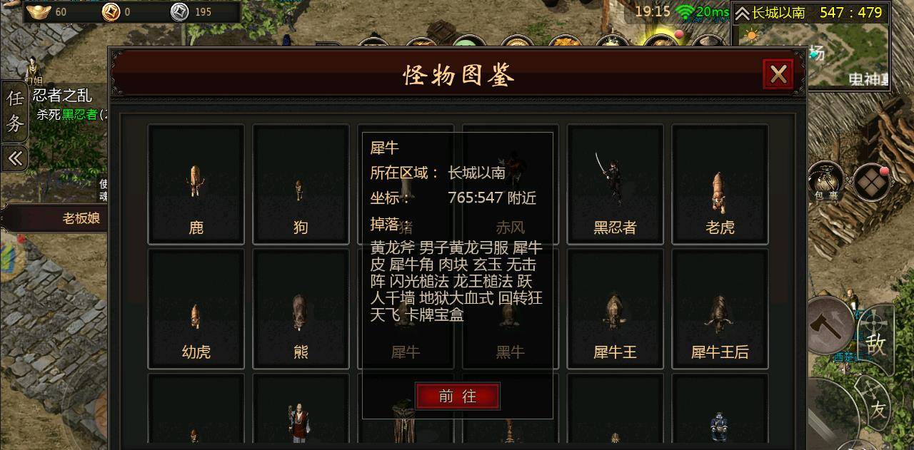 黑牛和犀牛是游戏内少数不会主动攻击而掉落装备的怪物,而且还是前期最需要的黄龙弓服和黄龙斧