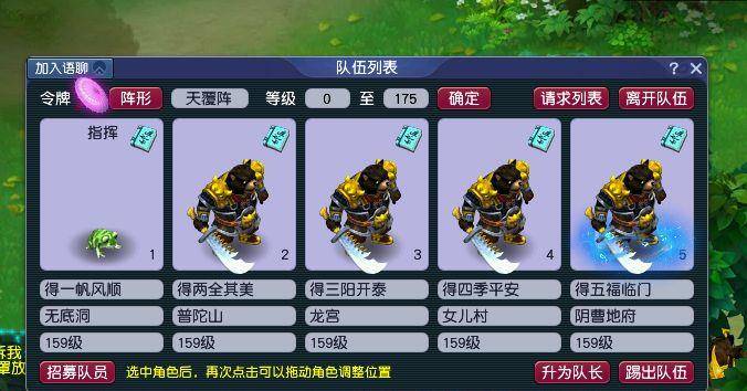 这组五开的组合阵容如上图所示,属于一组159级常规五门组合,无底洞、普陀山、龙宫、女儿村以及阴曹地府。