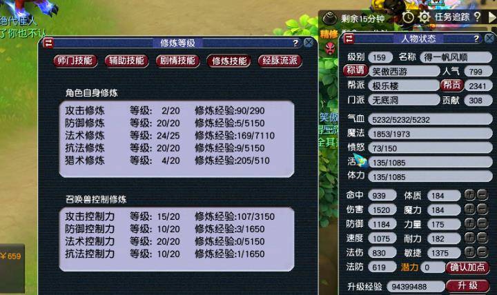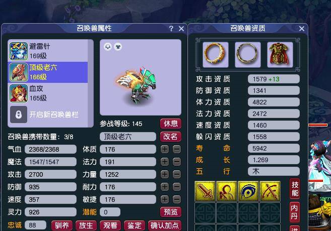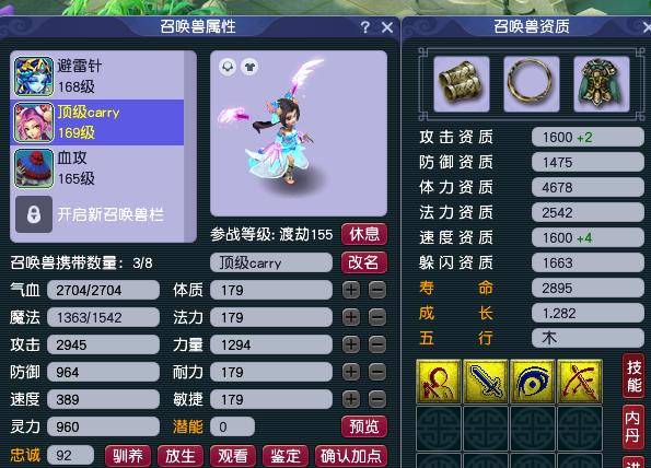 五个号现在配置的装备都是动物套,上图这个是队长号,入手的时候人修都是20-20-20,法修是这个自己慢慢点的,宝宝修炼入手的时候好像是10-10-13,反正都是参差不齐的,都是自己慢慢吃果子补起来的。看修炼知道需要花费多少钱了。