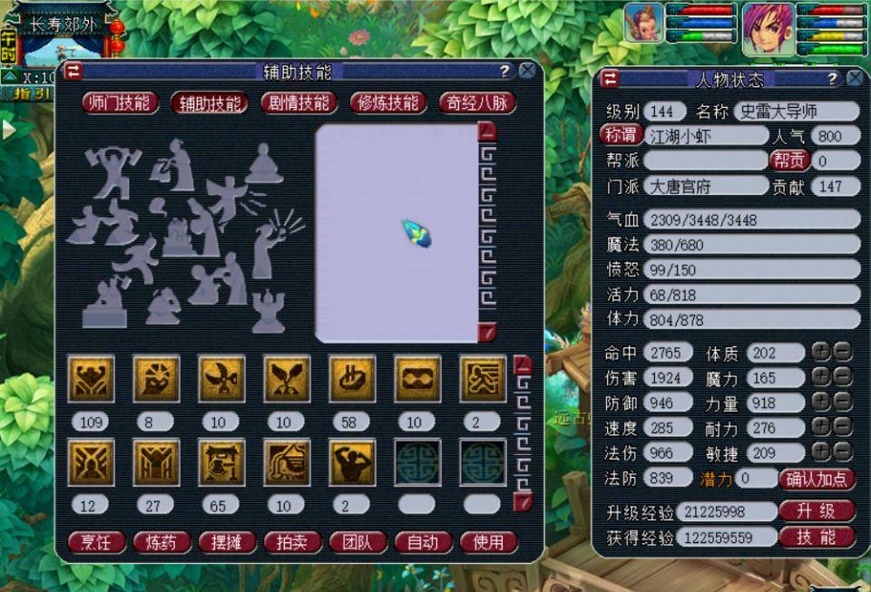 师门技能最高130级,纯属就是为了升级凑合数的。辅助技能点了109级的强身术,其它的可以忽略不计,根本没有生活辅助技能。