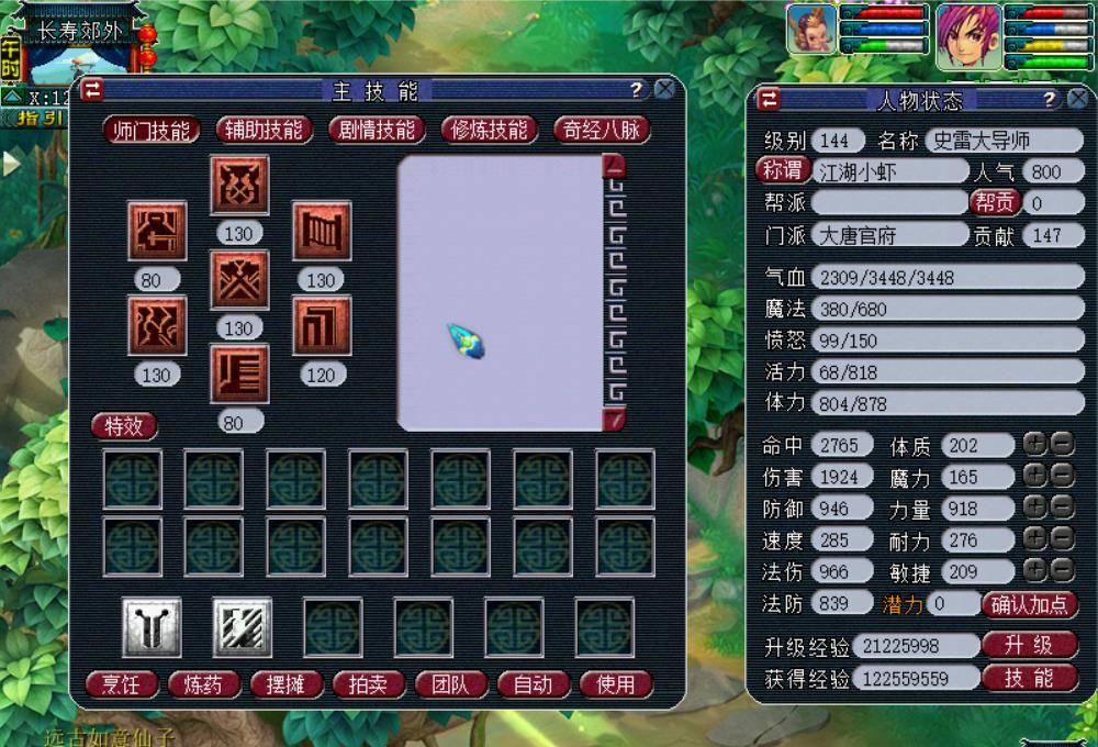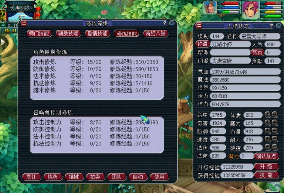 标准的打图账号,144级大唐官府,人物修炼只学习了15级的攻击以及10级的防御,宝宝修炼只有一个8级的控制力。人物属性面板情况,命中2765,伤害1924,防御都达不到1000,可见装备是有多么的烂。不过几百块钱的号还想有多好,能打死强盗就不错了。