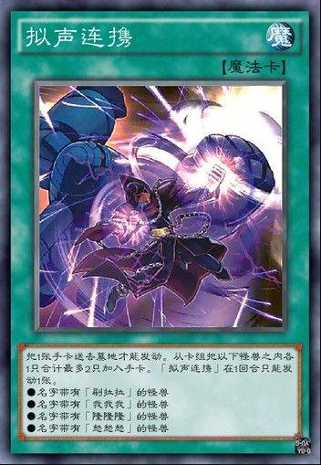 众所周知,在游戏王zexal中,九十九游马所使用的拟声卡组分为刷拉拉、我我我、隆隆隆以及怒怒怒四类,这四种怪兽原本联系并不是很足,不过为了让这四类怪兽的资源调度能力变得更强,官方陆续推出了拟声乌托邦以及拟声连携等覆盖了这四个拟声字段的卡牌,从而让这些字段的怪兽拥有更好的联动性,稳定展开的同时也能保证节奏的稳定,在超量时代引起了不小的轰动。