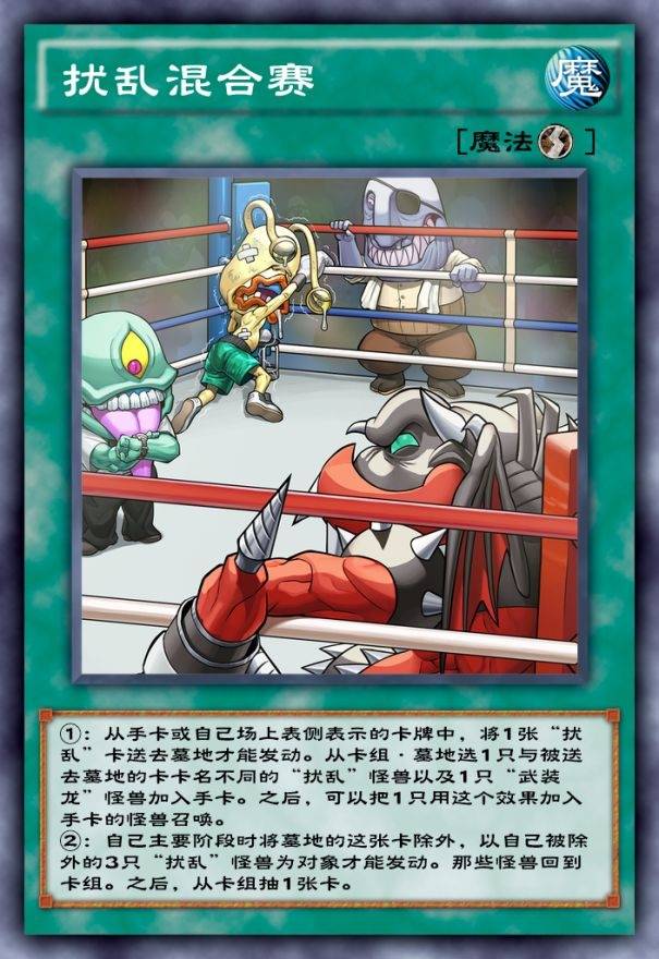 扰乱混合赛这张卡是我印象非常深的一张卡,因为在游戏王GX时代,万丈目后期所使用的卡组非常杂,不仅有扰乱、和XYZ,甚至还有武装龙这一从北方学院带来的体系,这些体系的怪兽本来风马牛不相及,不过随着扰乱混合赛的出现,使得万丈目所使用的体系逐渐开始有所联系。这张卡可以通过从手卡或者自己场上表侧表示的卡牌中送墓一张扰乱怪兽,从而在卡组或者目的选一只与送墓卡名不同的扰乱怪兽以及武装龙怪兽加入手卡,之后可以选择一张加入手卡的怪兽特殊召唤。这张卡的出现极大程度提升了扰乱以及武装龙的粘合度,在上手扰乱的情况下可以有效调动武装龙怪兽资源,这点还是非常不错的,算是多字段卡牌的一个代表。