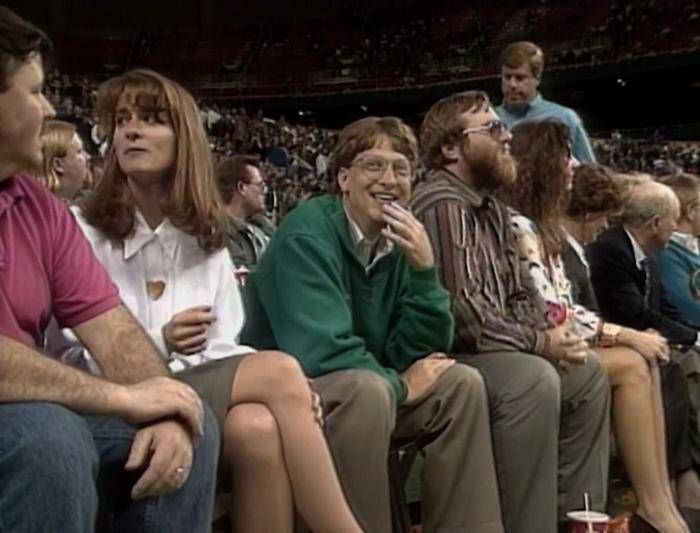 1993年,盖茨和未婚妻梅琳达(前排左二)观看篮球比赛