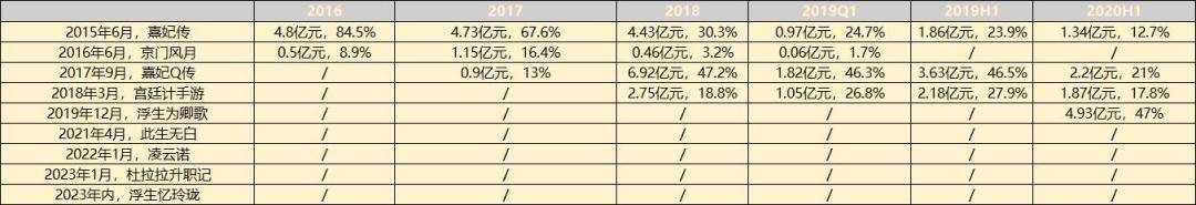 到2020年,虽无自研新品,但《浮生为卿歌》是在2019年12月31日公测,正式释放盈利能力其实就在2020。在2020年上半年,这款产品又接过了《熹妃Q传》的班儿,半年收入4.93亿元,占比47%。