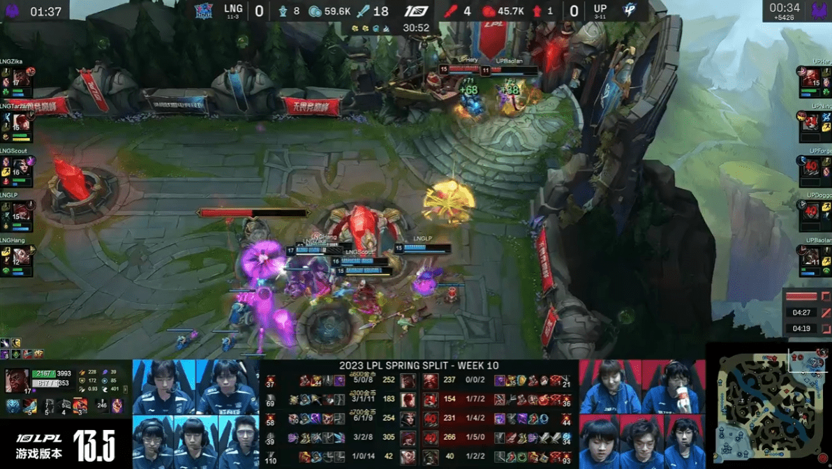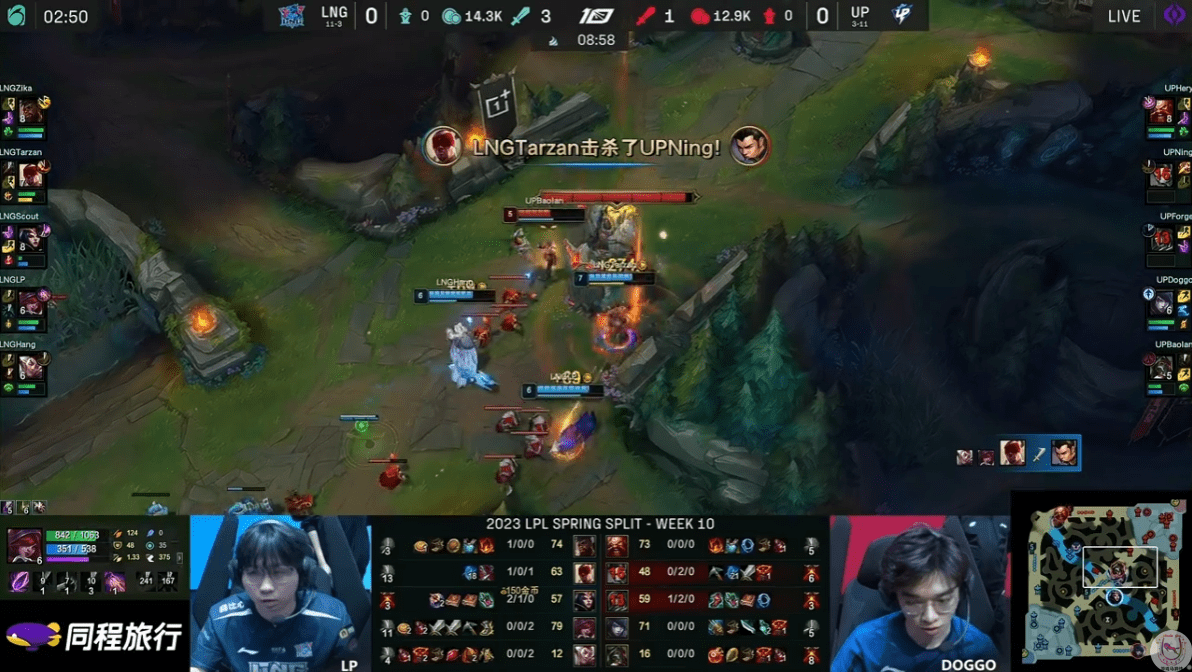 开局Tarzan的盲僧就通过反蓝限制住了Ning节奏,由于反野发育太顺,Tarzan的盲僧这局也是选择了输出装。UP原本打出了几波不错的机会,但由于这个团队基本上不存在什么默契沟通,因此在拉扯中最后都是被LNG拿下了胜利。