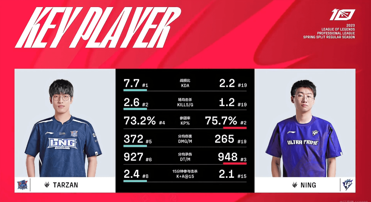 UP春季赛最后2场的对手是LNG和JDG,都是以打野强势出名的队伍,而且Tarzan和Kanavi不仅师出同门,也都和Ning有一些赛场上的梗。今天Ning先战Tarzan,虽然其个人很多数据基本都是联盟垫底,但官方还是在赛前把Key Player给到了双方的打野。而在很多观众看来,UP这剩下的2场比赛都是顶级享受局,尤其是结合某二路解说。
