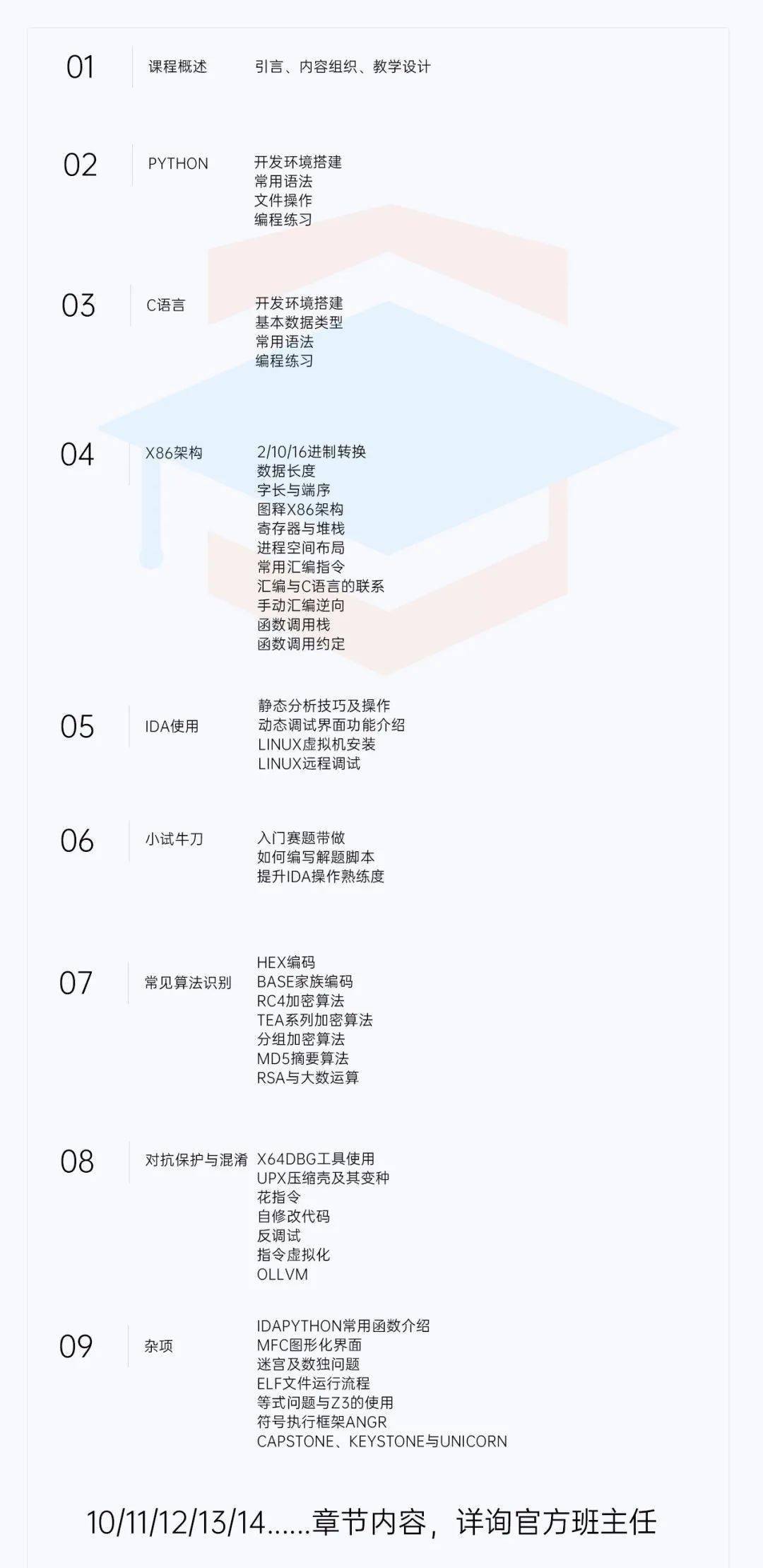 基本涵盖了CTF Reverse的每个知识点,实战演示、代码敲写等学员都可针对性提问