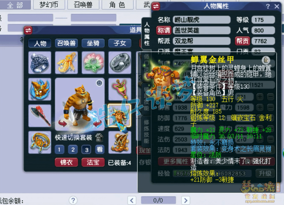 130级永不磨损长眉灵猴套铠甲,熔炼后敏魔双加46,防御248,打了12锻舍利子。