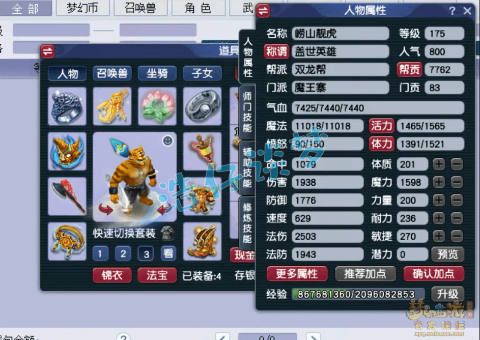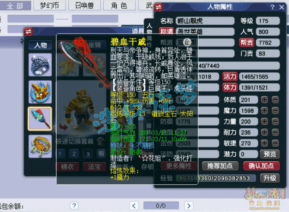 175级魔王寨打符之后的面板属性,不过没有打防御符,打好符能有1900多的防御,2503的法伤刷各种任务都能用了!