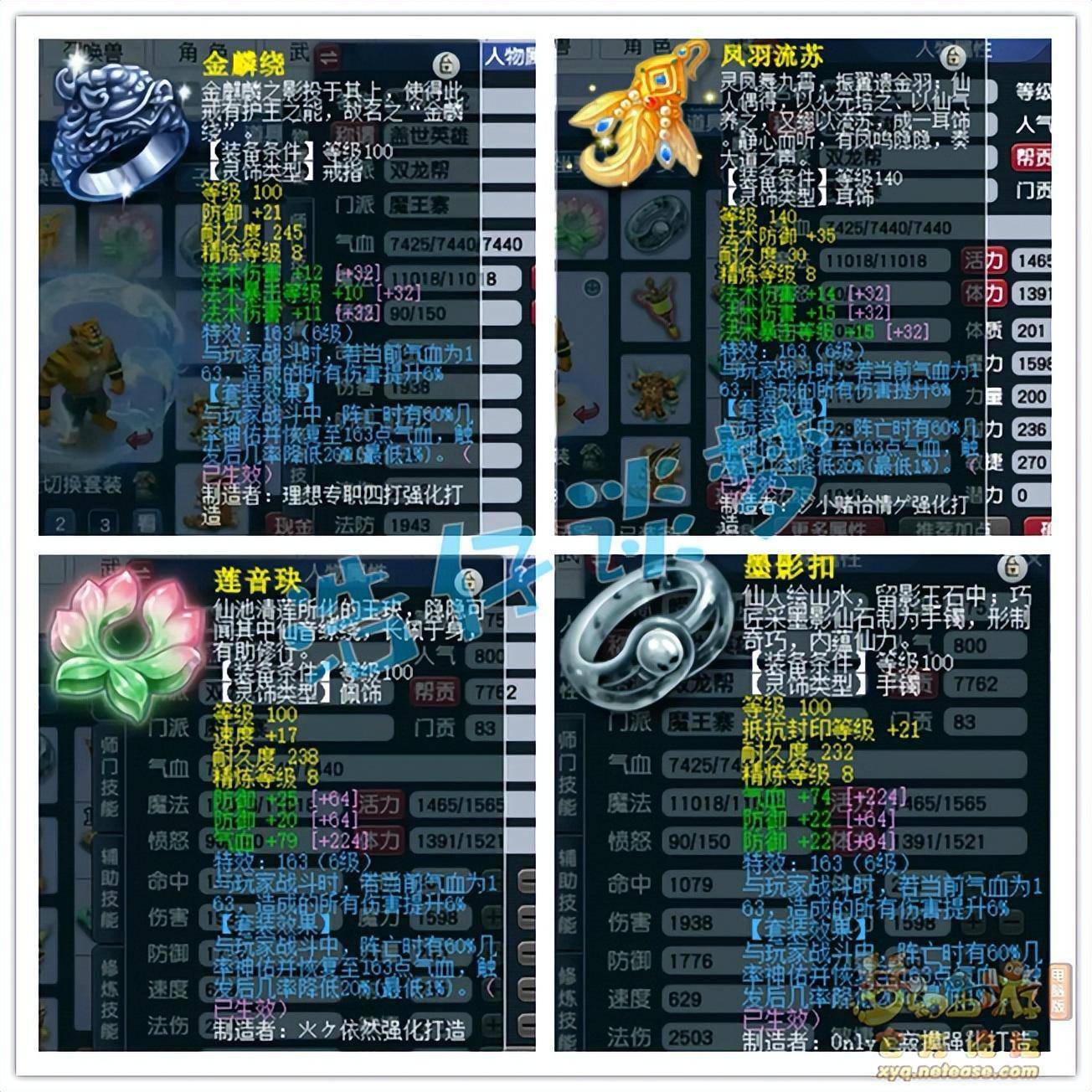 戒指和耳饰下排都是双法伤一法暴,佩饰和手镯下排都是双防御一气血,全部打了8锻星辉石,特效6级163。