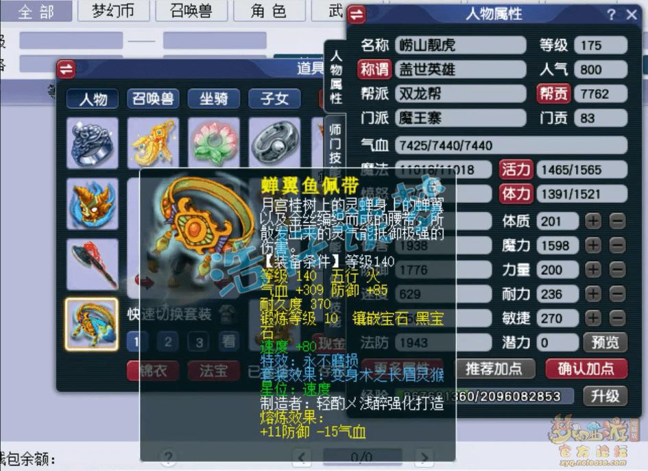 140级永不磨损长眉灵猴套腰带,打了10锻黑宝石。