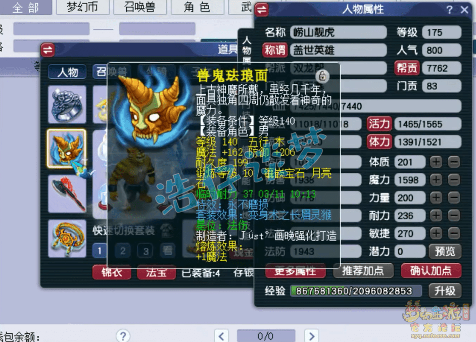 140级永不磨损长眉灵猴套男头,打了10锻月亮石。