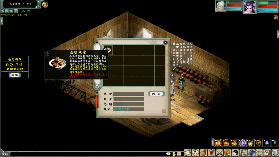 忘忧酒馆备好了茶酒点心,诸位少侠一路奔波辛劳,可前往长安(93,65)找店小二进入忘忧酒馆歇息修行。活动期间,每分钟为1轮修行,每天可进行360次修行,找酒馆老板购买 清明寒食,还可以使召唤兽修行事半功倍。