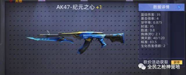 纪元之心AK47,装配一刀致命的刺刀,本身伤害较高,一枪爆戴头盔的敌人,穿甲伤害减低,换弹速度快。基础伤害35,暴击倍率4,穿甲率0.875,射速95,跑速0.8,换弹2.1,弹夹数40/120,精准83.5,生化伤害倍率2。拥有高额的基础伤害,爆头可以打出108的暴击伤害,可以瞬间秒杀对手,获取方法可以通过砍价活动获得;或者通过开竞技模式的掉落的宝箱集齐碎片兑换,虽然稳定较差,不过大佬们也找到了解决方法,在对局中我们依靠点射来压枪可以很大程度的消除后坐力!