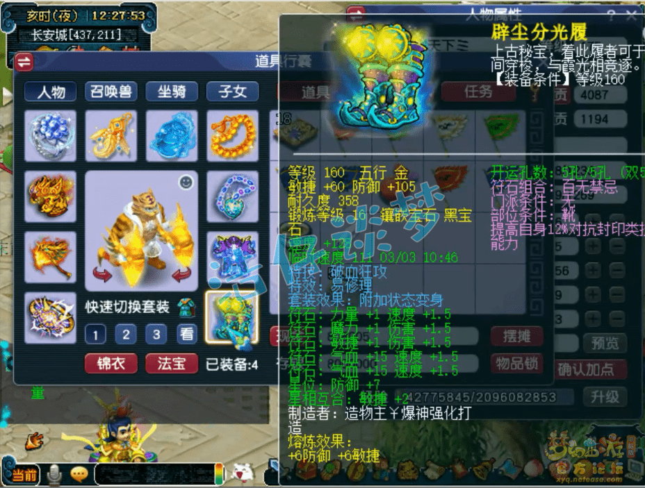 160级破血狂攻变身套鞋子,熔炼后敏捷66防御111,打了16锻黑宝石,属性很不错!