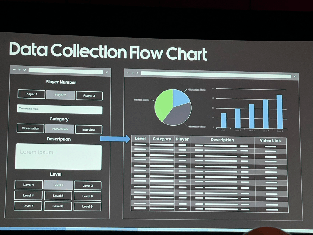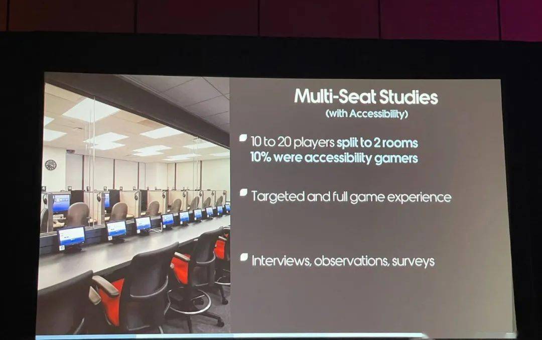 比如,残障人士被试是很难招募到的,因此需要尽早开始招募,在全球范围内多站点进行招募也很重要;同时要做好玩家社区运营。鉴于有的研究项目被试资源较少,所以线上测试的方式是性价比比较高的。测试内容需要针对残障人士进行专门的设计,以验证应该如何更好地适应他们。在数据采集和整理的过程中,索尼SMS主要使用工具化的形式,比如单个玩家的反馈整理成问题清单,整合成玩家—问题描述—玩家游戏录屏的数据格式。此外,索尼的观察室设置很合理,每一个玩家座位对应一个观察位(单面镜),通过单面镜可观察玩家,同时桌上有显示器可以同步玩家的体验实况。
