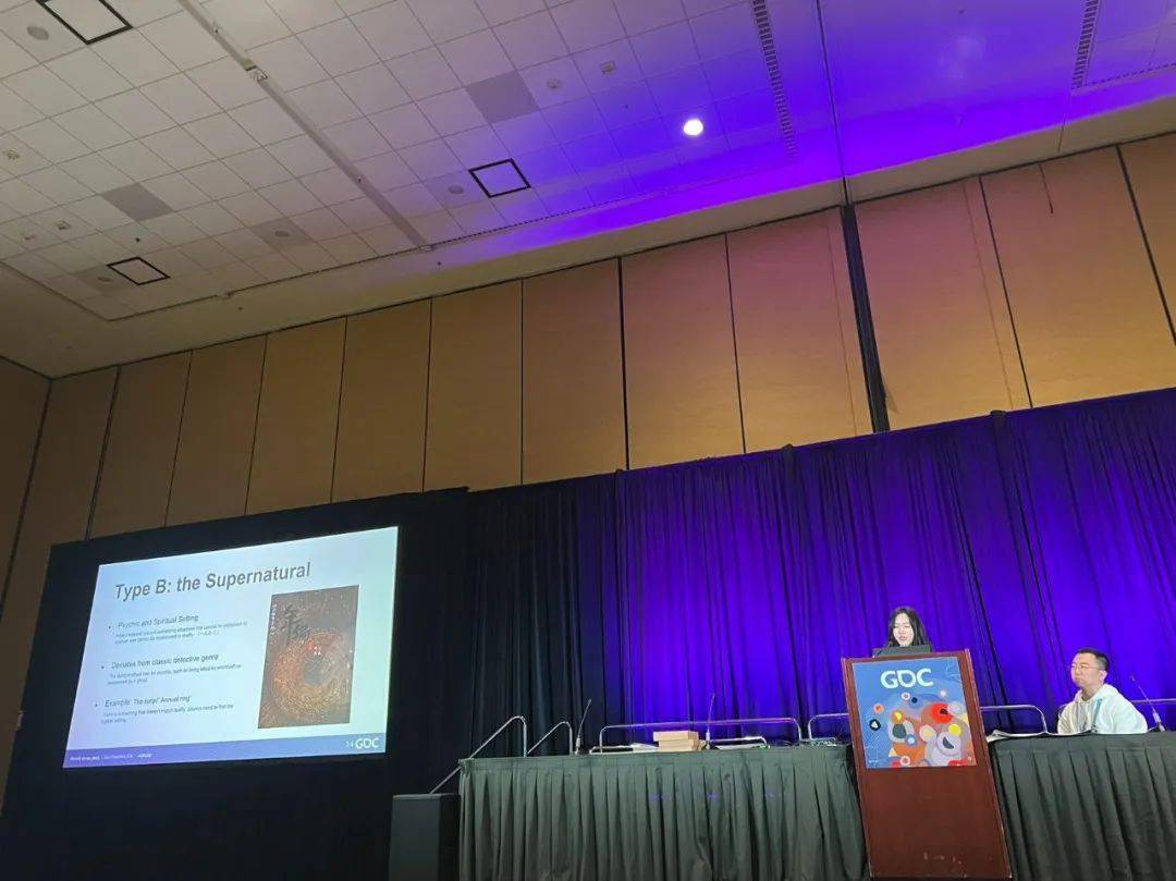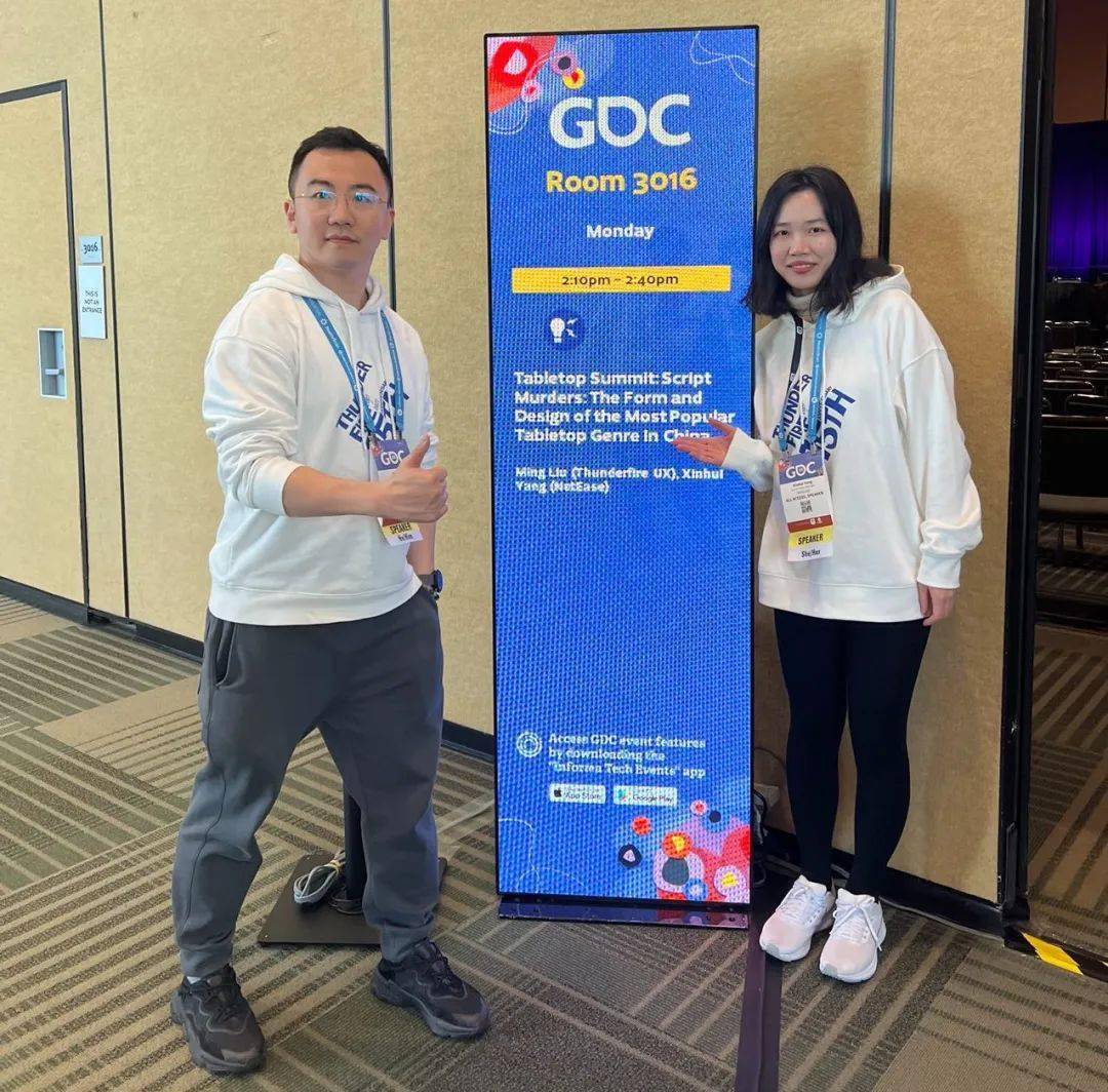 旧金山时间下午2点10分,首先登场的是位于莫斯康中心3016的“桌游峰会”单元,雷火UX用户研究部负责人Ming Liu和项目经理Xinhui Yang,30分钟的演讲主题为《剧本杀:中国最流行的桌游形式与设计》。