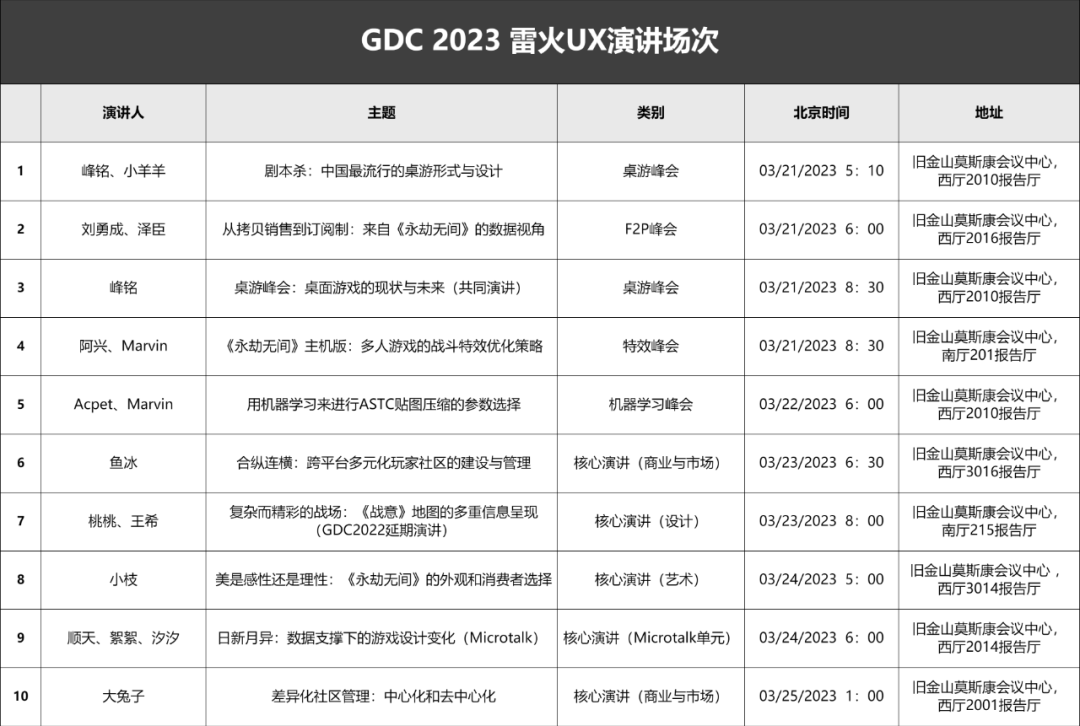 全球游戏行业年度盛会GDC2023已于3月21日在旧金山拉开帷幕,雷火UX为全球开发者带来的10场精彩演讲也开始陆续登场。在此次GDC之旅中,雷火UX的speaker不仅是分享者,与全球游戏开发者们共同探讨行业前沿动向和发展趋势;也是学习者,通过聆听GDC分享,以更多视角感受全球游戏开发的前沿理念,以便为之后的全球用户研究、本地化、社区运营、体验设计、大数据和推荐策略等方向的工作持续输出洞察。