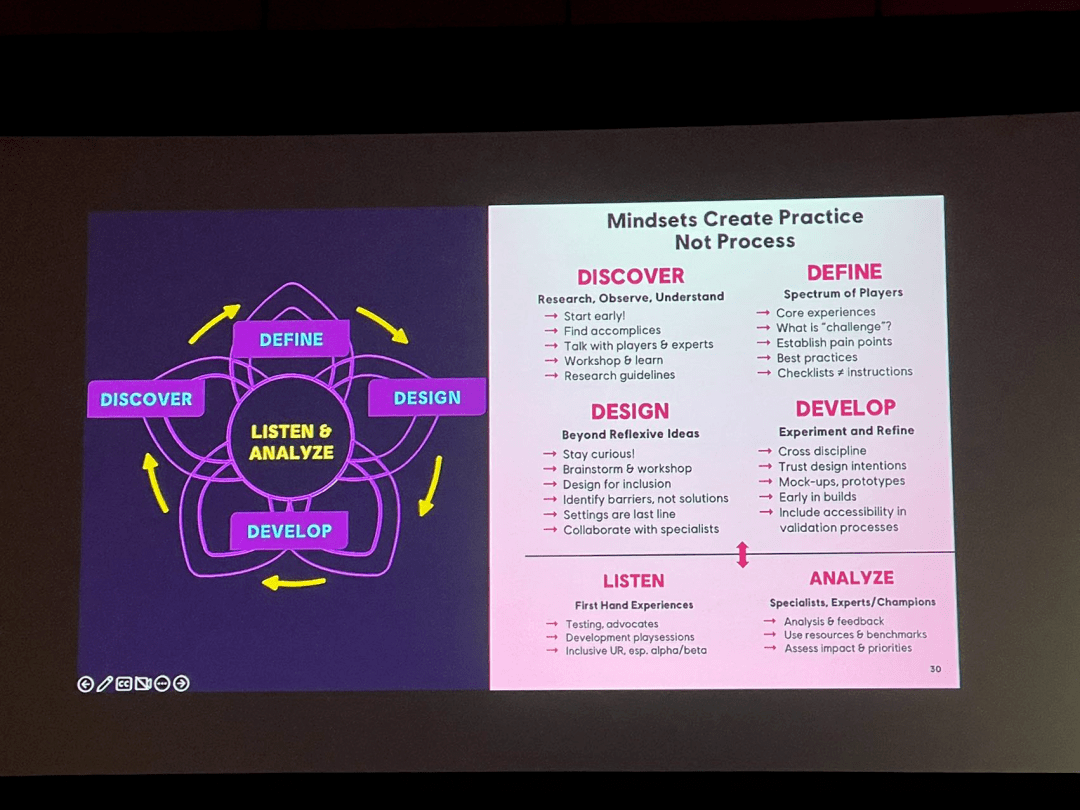 桃桃去UX峰会观看了育碧无障碍设计负责人Aderyn Thompso的演讲,她分享的主题是“ Accessibility by Design: Finding Our Way on the Path Less Traveled”。她讲述了自己对“无障碍”这个概念的新理解,在已经成为普遍观念的当下,开发者应该对无障碍设计有更先进、更细致的理解,从“无障碍选项”进入无障碍设计的新时代。她在GDC2018上首次进行分享时,还只是主张游戏应该提供“无障碍选项”;而5年后的GDC2023上,她主张无障碍不应该只作为一个单独的辅助系统存在,而应该融入游戏整体的设计。