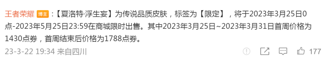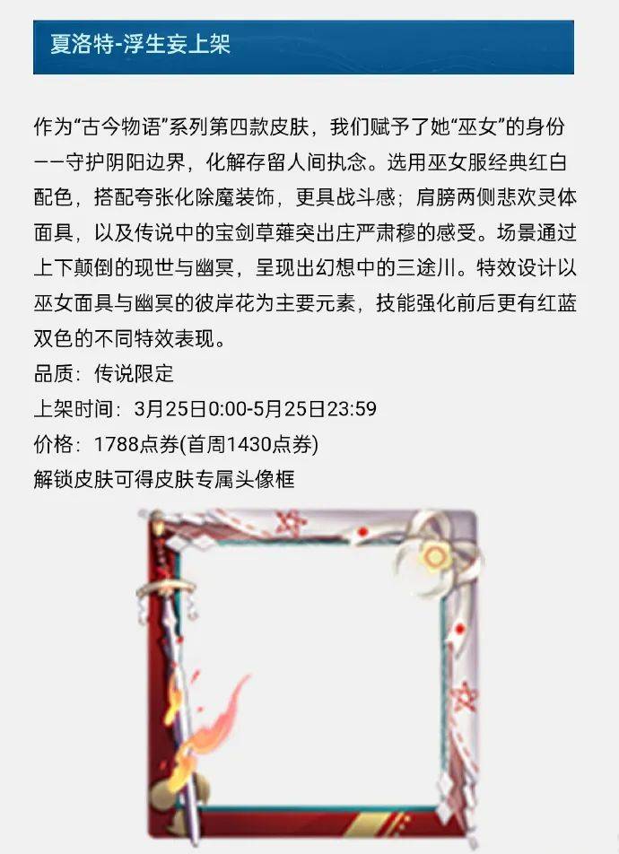 皮肤上线时间是本周六,也就是3月25号。可能当时这款皮肤确实有至尊标签的考虑,只不过提前被爆料出来,玩家们的声音,更期待的是传说品质。所以才有了这个结果。