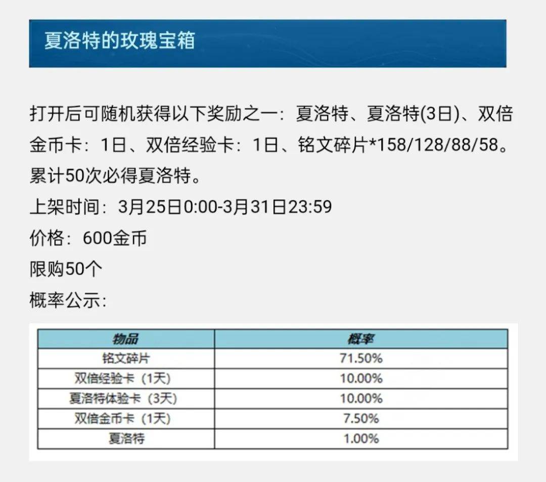 如果你还没有夏洛特这个英雄,也没有关系,更新后有活动是可以获得夏洛特的。那就是夏洛特之前上线时出过的宝箱活动。我的夏洛特就是通过这个渠道获得的。