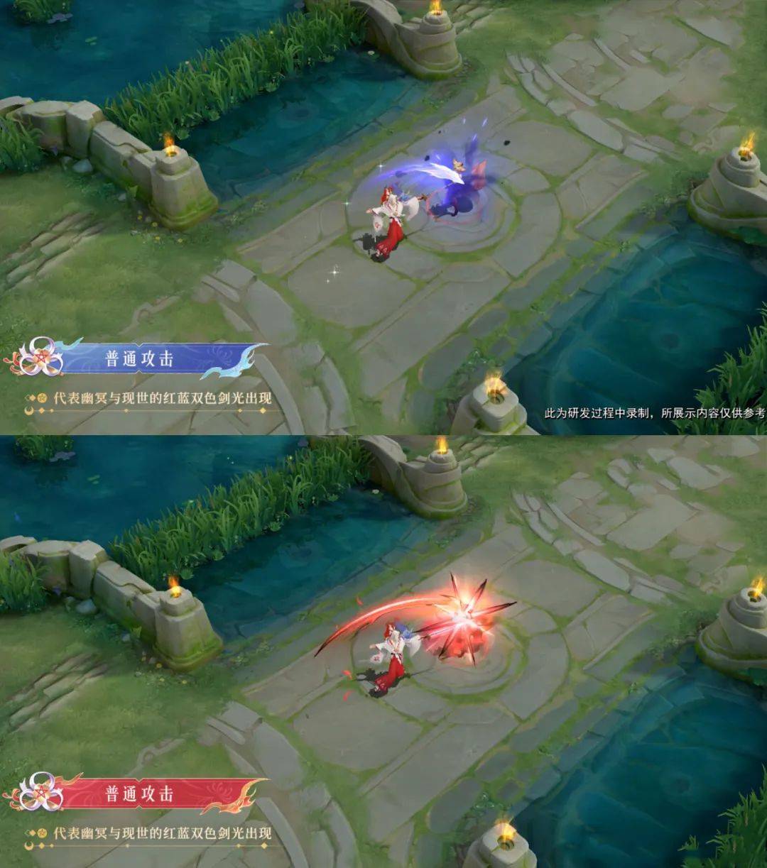 普攻就有两套展示,红蓝双色光剑,蓝色应该就是幽冥,而红色应该是现实。普攻除了颜色,区别不大。但是技能的特效,就不单单只是颜色的区别了。