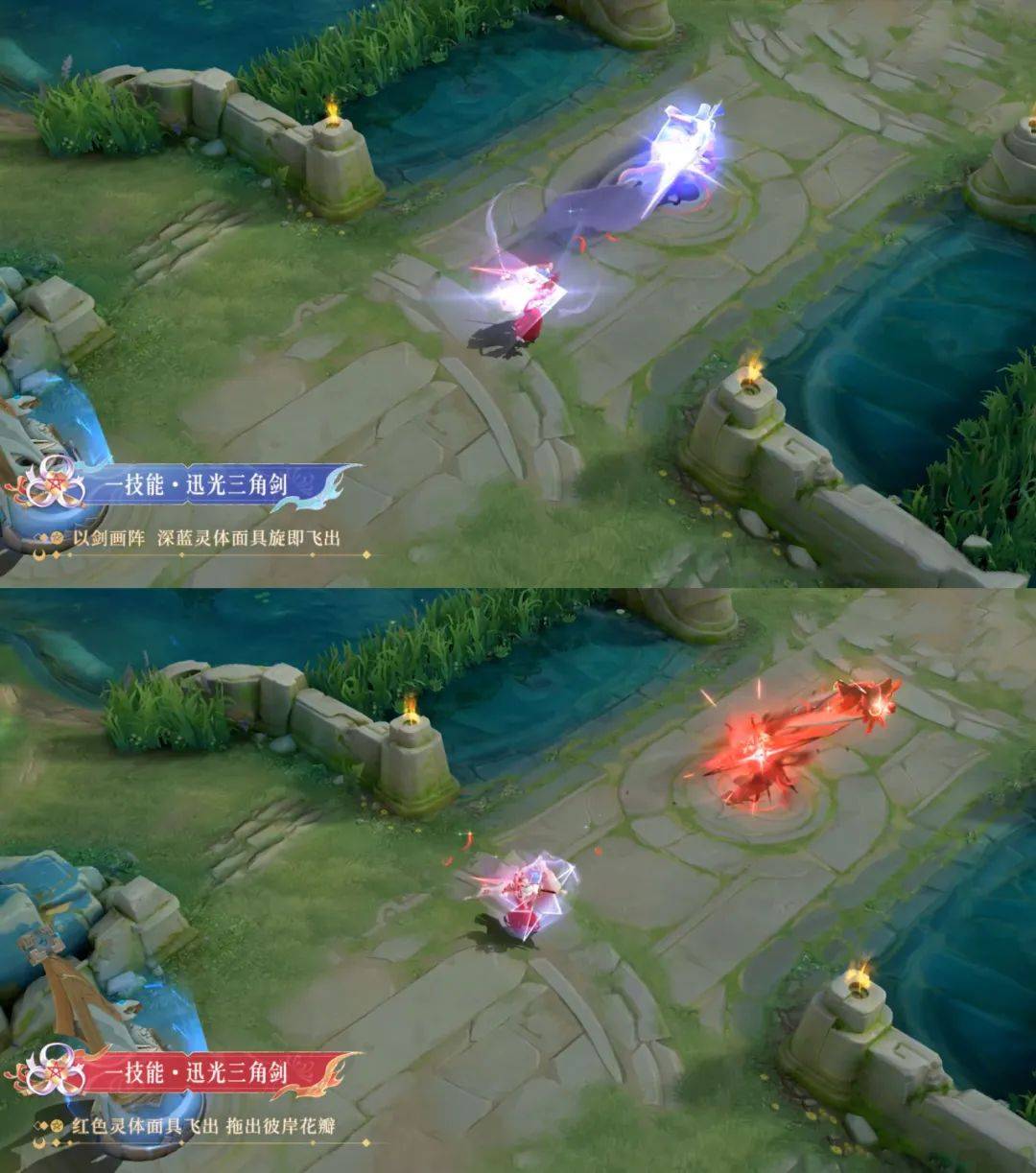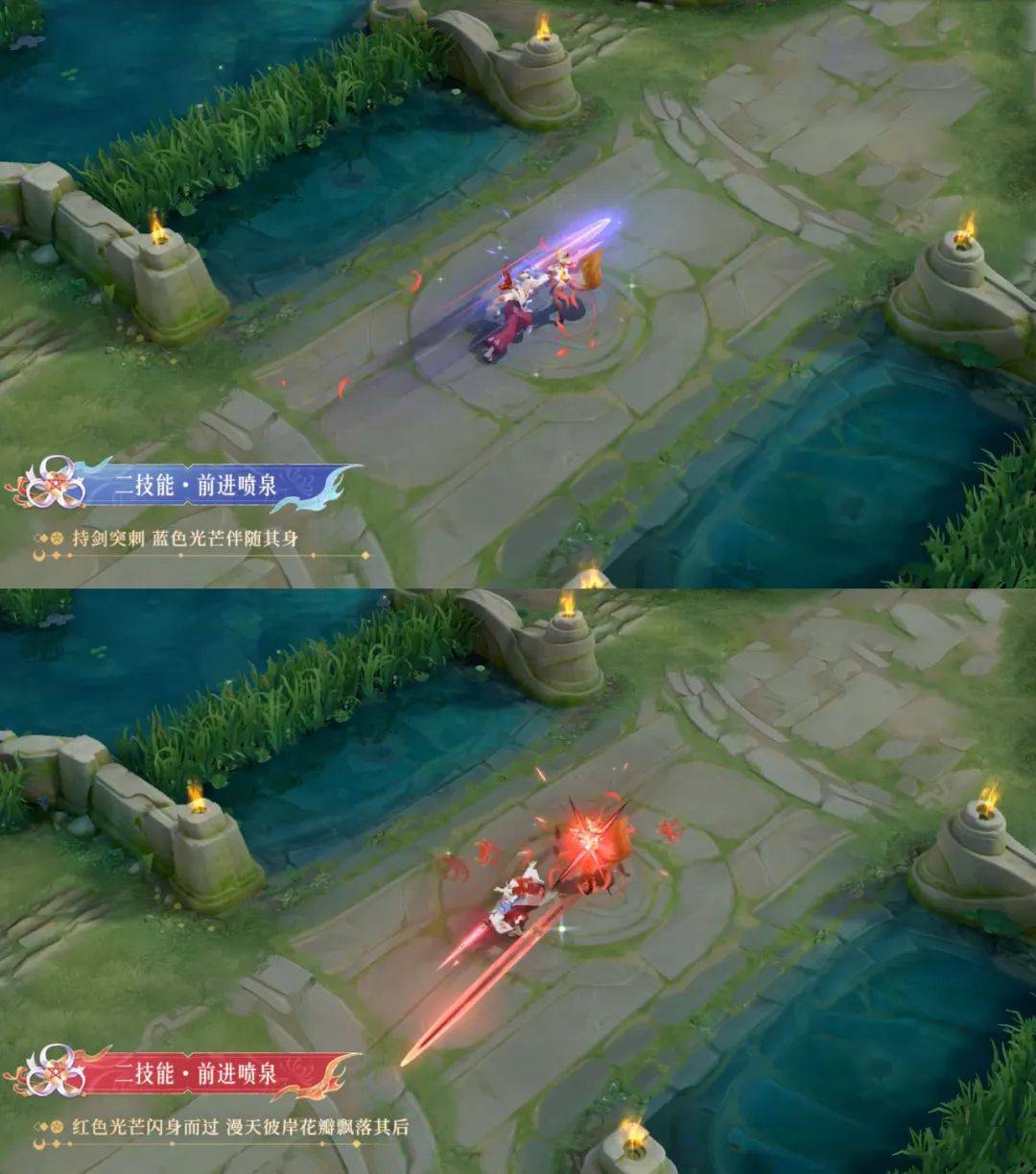 二技能突刺,一种表现是蓝色光芒,另一种表现是红色光芒,同样还有彼岸花飘落的特效。