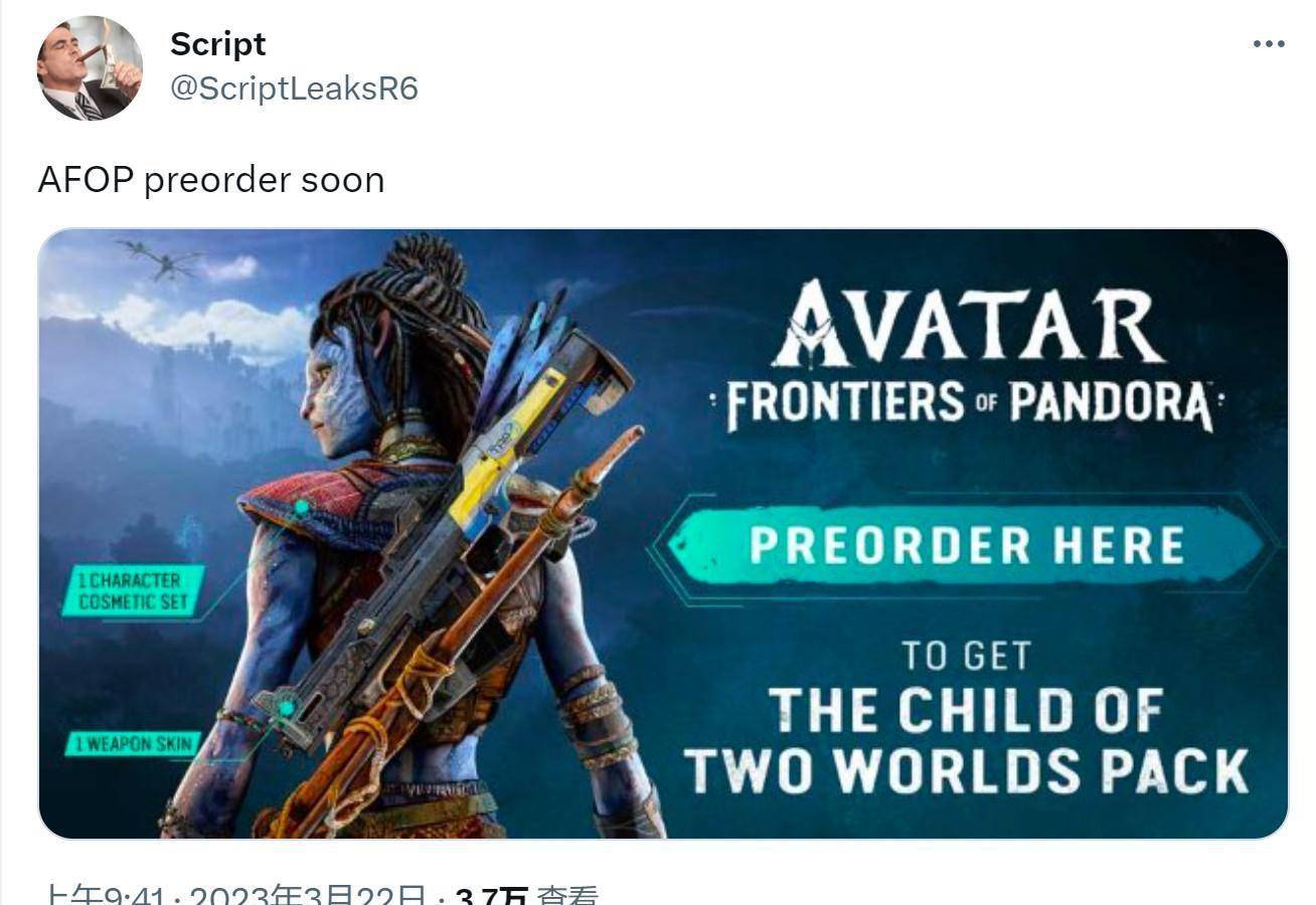 如上图,预购《阿凡达:潘多拉边境》将将获得“The Child of the Two Worlds”包,包括一个角色皮肤套装和一个武器皮肤。
