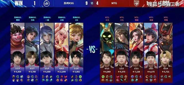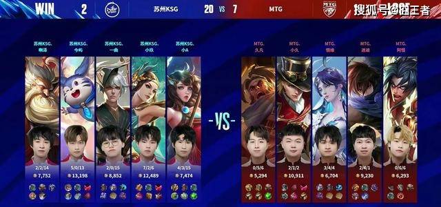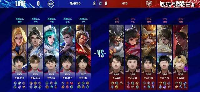 第一局比赛中,苏州KSG蓝色方,拿到了赵怀真+狄仁杰。MTG红色方,拿到了宫本武藏+李元芳。开局MTG击杀对面中辅,拿下一血。16分钟苏州KSG直推中路一塔。17分钟,苏州KSG击杀对面上野。决胜团,MTG强行开团,瞬秒狄仁杰,一波零换三,直推水晶,先下一局。