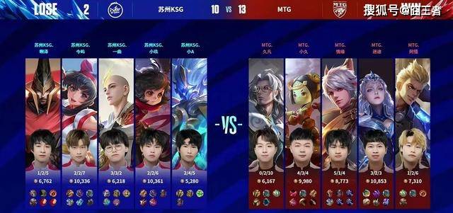 第二局比赛中,苏州KSG蓝色方拿到了曜+公孙离。MTG红色方,拿到了娜可露露+莱西奥。开局苏州KSG击杀不知火舞,拿下一血。6分钟,苏州KSG直推中路一塔。决胜团,苏州KSG孙膑大招配合弈星大招留住三人,苏州KSG公孙离输出拉满,拿下双杀,一波零换四,直推水晶,扳回一局。