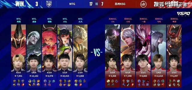 第三局比赛中,苏州KSG蓝色方,拿到了梦奇+虞姬,辅助大乔。MTG红色方,拿到了澜+马可波罗。开局苏州KSG击杀项羽,拿下一血,打出一波一换四。7分钟,苏州KSG集火带走海月,打出一波一换二,直推中路一塔。13分钟,苏州KSG直推中路高地,经济差拉开八千。决胜团,苏州KSG一波团灭MTG,直推水晶,拿下赛点。