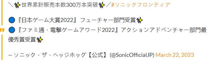 在《索尼克:未知边境》首次免费更新之前,世嘉宣布该作自发布以来,销量已售出300万套,距离2月10日公布290万套有一个多月的时间。迄今为止,这款游戏销售量已超过世嘉预期。