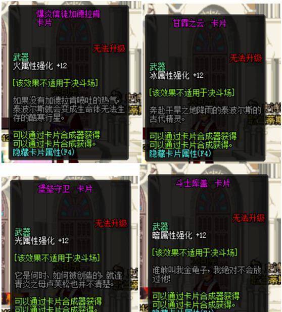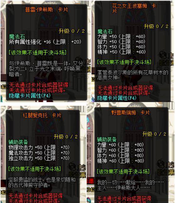 武器12属强卡片固然是好,但这四张卡片才是真正的“8E”卡,魔法石终于不再是心脏卡一家独大,新的这张普雷伊希斯卡片所有属性强化能加到20,这张卡片出来心胀卡肯定是要降价的。对于奶来说巴不得所有部位都能打上四维附魔,没错,现在魔法石的附魔只有春节宝珠能加四维,其他卡片没有能加四维的,而新的卡片魔法石附魔四维能加到60点,奶的附魔一般都比较贵,特别是这种稀有四维附魔,更加是天价。而能取代安徒恩左曹宝珠的附魔也出现了,红腿爱克托卡片三功能加到70,对一个职业的提升也是非常可观的。