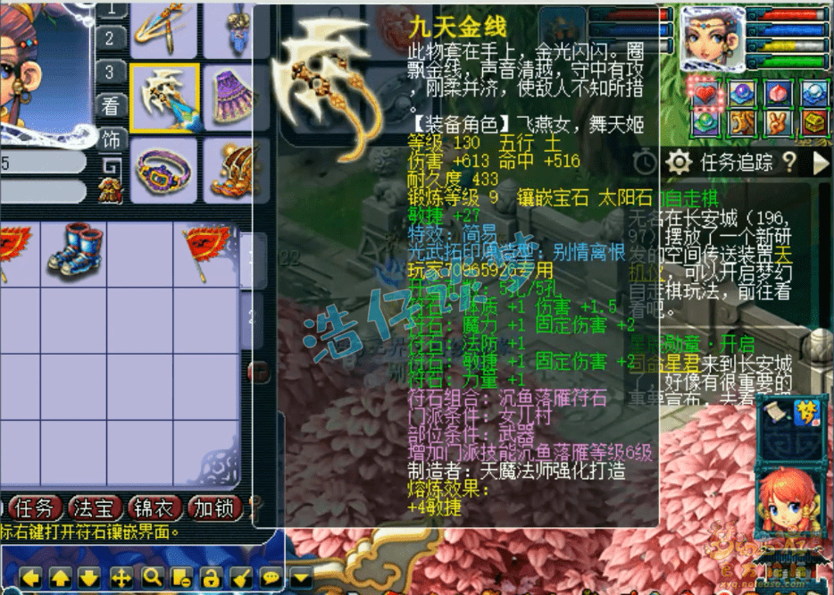 130级简易武器,熔炼后单加敏捷31,打了9锻太阳石,伤害达到了613,非常不错。打了沉鱼落雁符石,同样能增加固伤。
