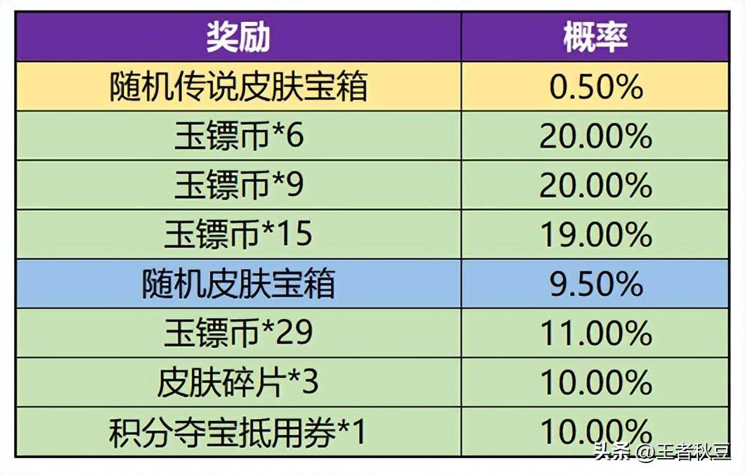 每一次的抽奖概率如上展示:随机传说皮肤只有0.5%概率,随机皮肤概率只有9.5%,剩下的就是玉镖币和皮肤碎片或积分夺宝券。