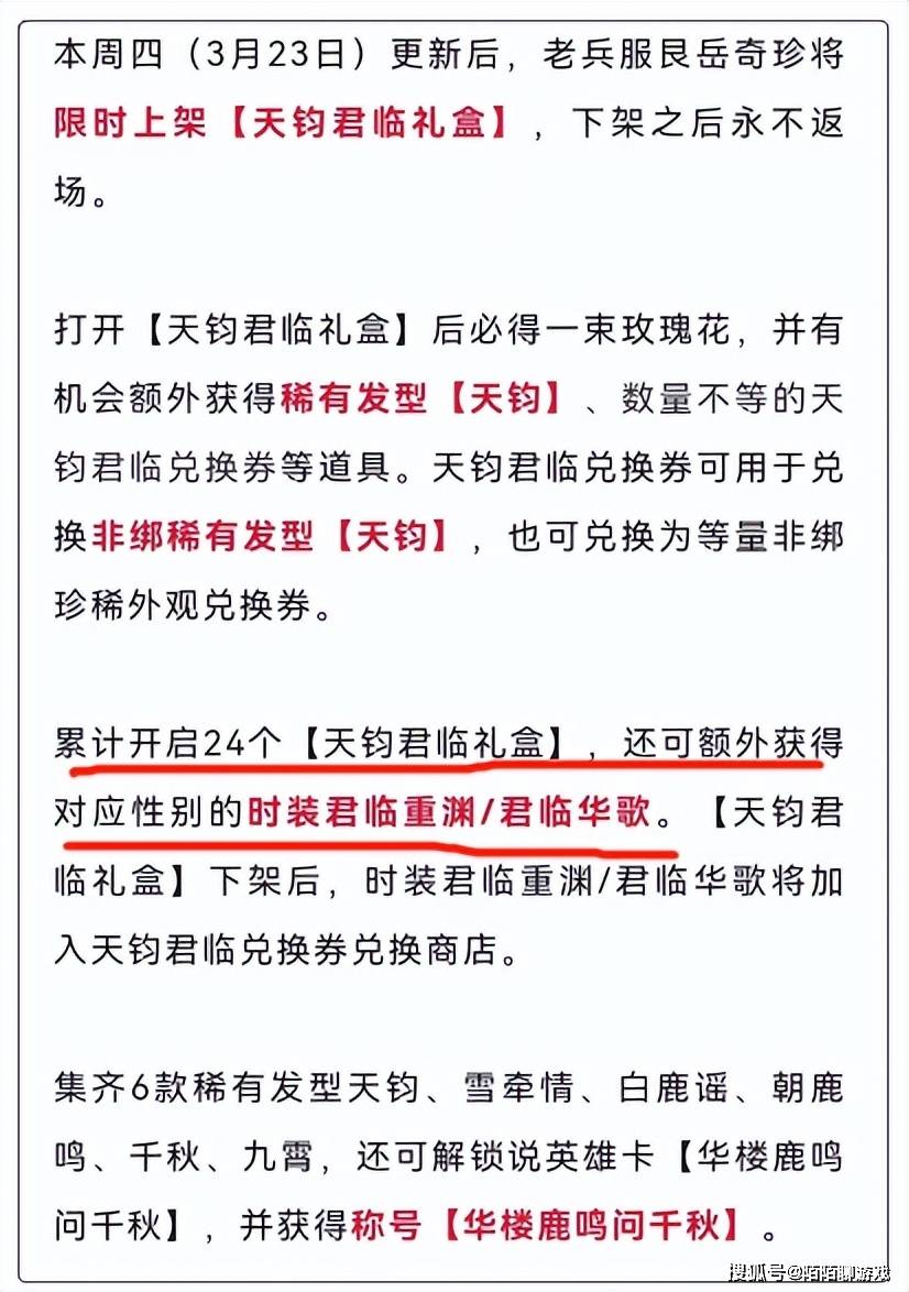 君临系列时装还没有上线,就有玩家发现,这次的时装开盒更为良心,官方表示:累计开启24个【天钧君临礼盒】,还可额外获得对应性别的时装君临重渊/君临华歌。