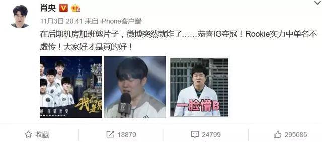 围攻结束后,肖央发文:“后来我在机房加班剪片子,微博突然炸了……恭喜IG夺冠!新人力量当之无愧,大家真的太棒了!”“