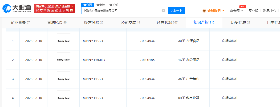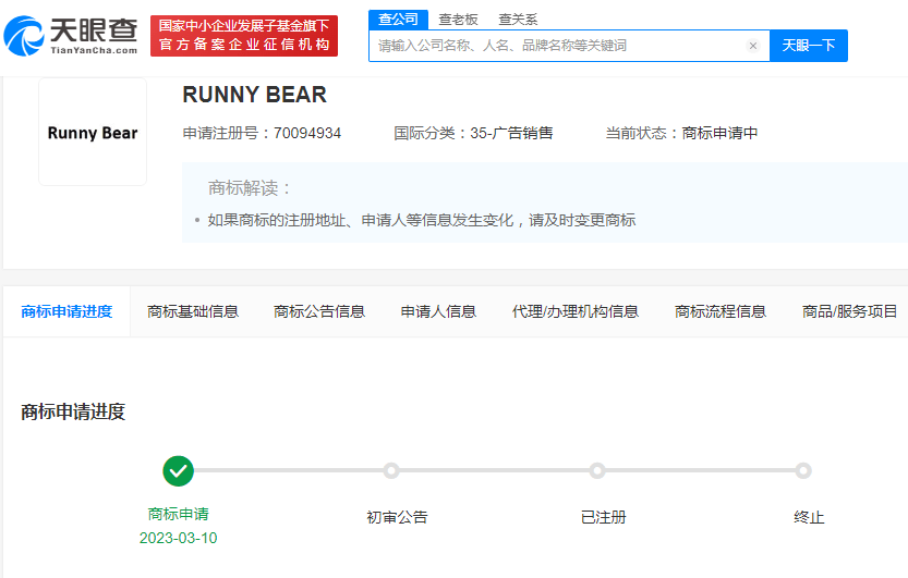 天眼查App显示,近日,RNG电竞俱乐部关联公司上海竞心承峰传媒有限公司申请注册多个“RUNNY BEAR”“RUNNY FAMILY”商标,国际分类涉及广告销售、科学仪器、方便食品等,当前商标状态均为申请中。