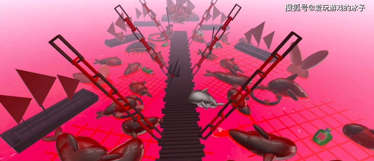 另外也有呼吁保护海洋生物的《海豚湾之恋》。这张地图在进入之初的第一感受也是美丽与自由,在海豚环绕的海洋乐园中奔跑跳跃,欣赏着沿途的蔚蓝风光,度过一个个难关最终抵达终点。但是在终点处稍站片刻,一个被猩红色所充斥的“坟场”骤然升起。弥漫着死亡的鲜红与刚刚美好的湛蓝形成鲜明对比,不由地便会激起孩子们保护海洋环境的责任心。《蛋仔派对》由此又传达出环保与公益的重要性。