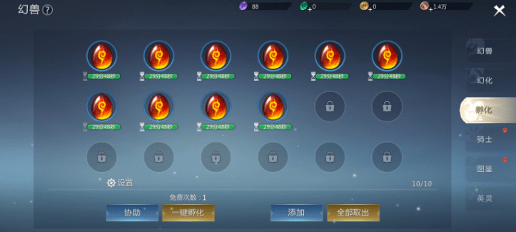 选择好心仪的幻兽以后,最重要的就是如何培养自己的幻兽。目前幻兽培养主要分为孵化以及幻化两部分。所谓孵化就是通过幻兽蛋去孵化幻兽,目前游戏中初始会有10个孵化槽位给到大家,前期不需要先急着解锁新的位置,坑位完全够用。尽量把道具资源用到刚需的地方。